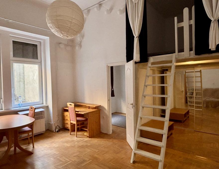 Kiadó a 9. kerületben a Ferenc körúton egy csendes, mégis rendkívül frekventált helyen található, jó állapotú, 42 m² + 12 m² galériás nappali+1 hálószobás lakás.