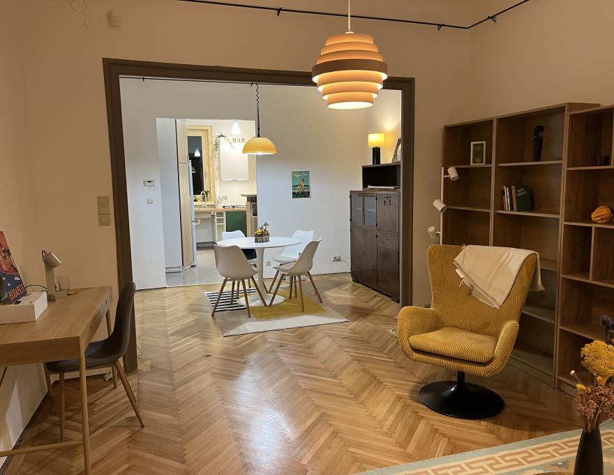 Tágas, nagy alapterületű terei könnyen élhetővé teszik a lakást – ablakai közvetlenül a parkra, hátul pedig a csendes belső kertre nyílnak. Belmagassága kellemes 305 cm.